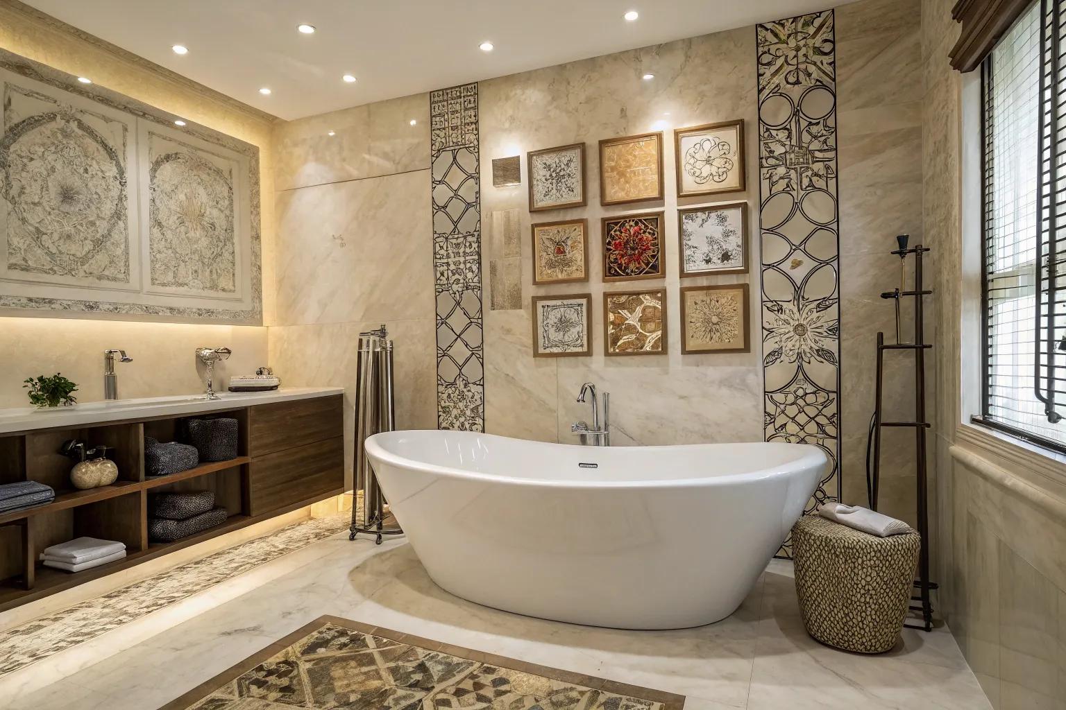 Mosaic patterns turn bathtub walls into artistic masterpieces.